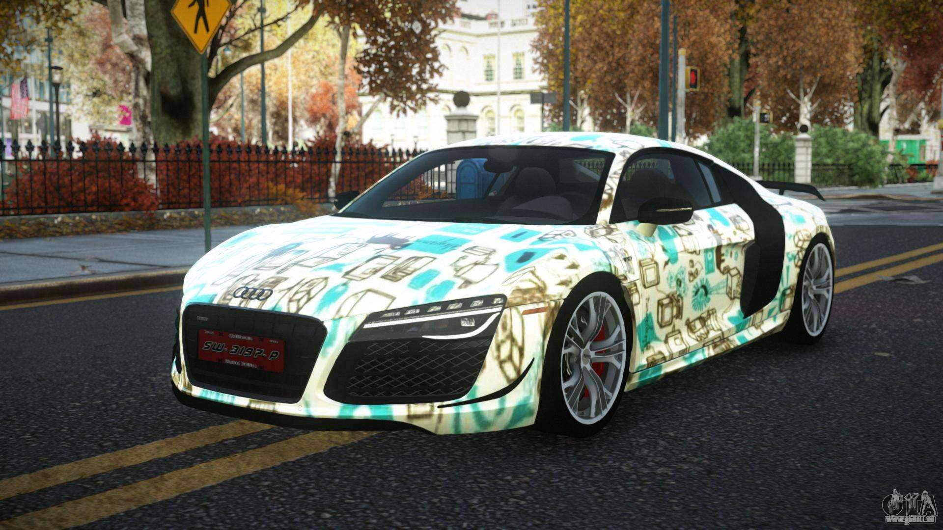 Mod Audi R8 Mican S3 für GTA 4 kann unten unter den Links heruntergeladen werden. Die Modifikation wird standardmäßig automatisch installiert, um die Banshee zu ersetzen, und mit Hilfe unseres Installers können Sie sie auch durch jedes Standard-Spielfahrzeug ersetzen.